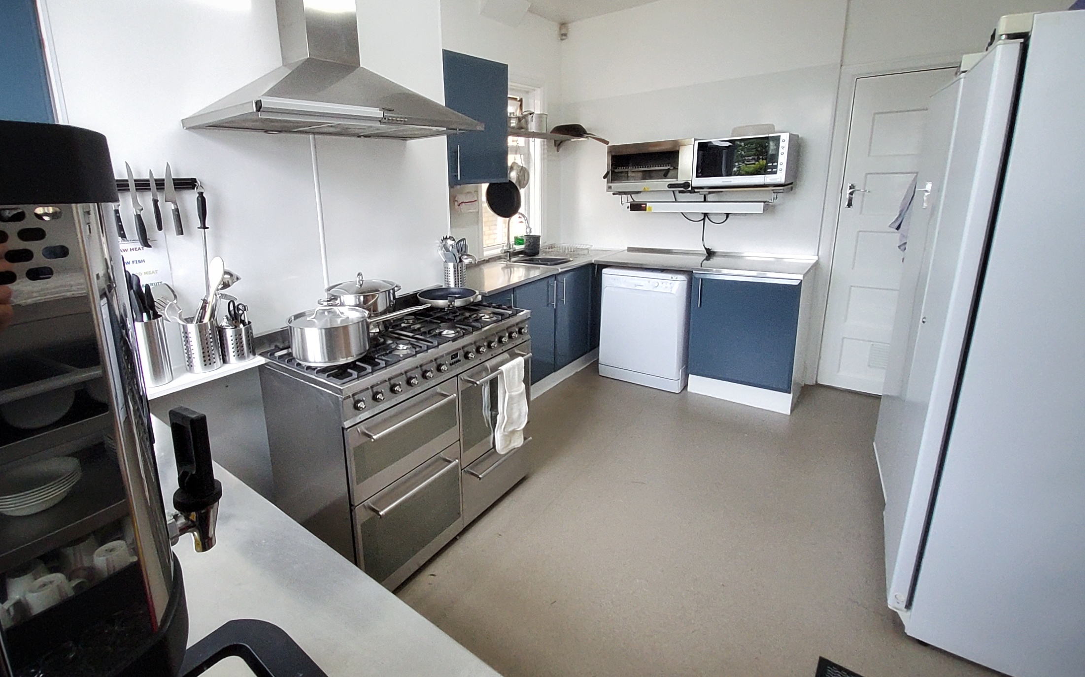 Finally there is a commercial kitchen, perfectly set up to cater for large groups. A Smeg cooker with 7 rings and 3 ovens is complemented by a commercial grill, microwave and even a heat lamp to keep meals warm as they are prepared. There is also a toaster and a boiling water dispenser ready for people to help themselves to breakfast. Finally a commercial fridge and freezer plus a walk-in pantry provide plenty of space for storing your provisions.